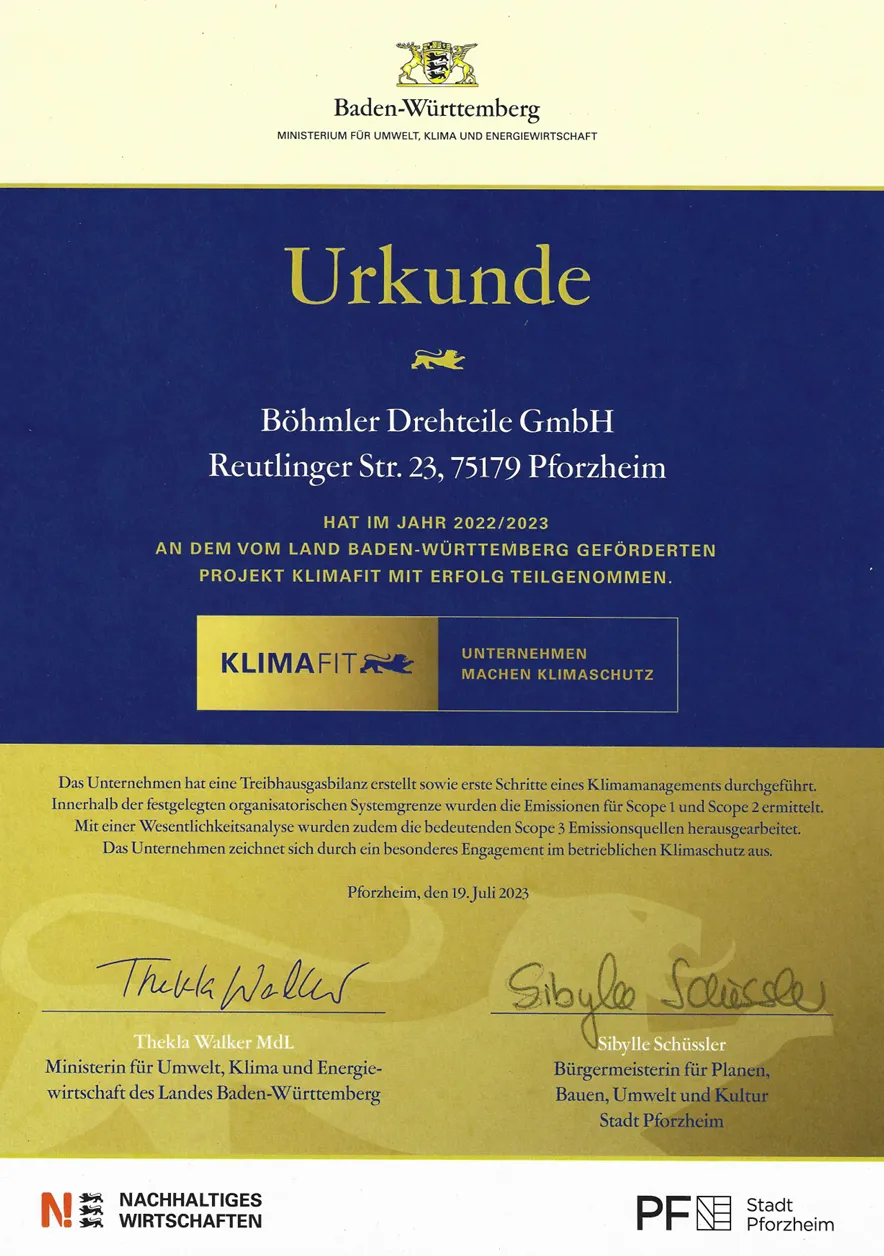 BÖHMLER Drehteile ist offiziell „KLIMAfit“